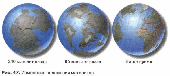 Горизонтальные движения происходят из-за перемещения литосферных плит. Вместе с плитами перемещаются и материки. Скорость горизонтальных движений небольшая — несколько сантиметров в год. Однако они сохраняют свое направление очень долгое время, поэтому за многие миллионы лет континенты передвигаются относительно друг друга на сотни и тысячи километров (рис. 47).
