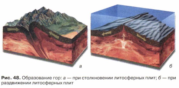 Горизонтальные движения играют огромную роль в создании рельефа Земли. На границах литосферных плит образуются горы (рис. 48).