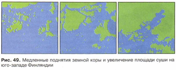 Вертикальные движения поднимают или опускают отдельные участки суши и дна океанов (рис. 49). Опускающаяся суша затапливается морем, поднимающееся дно моря, наоборот, становится сушей.