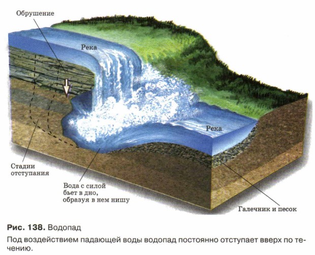 Гидросфера § 39. Жизнь рекЕсли река встречает на своем пути крутые отвесные уступы твердых пород, то образуются водопады (рис. 138). Высочайший в мире водопад Анхель находится в Южной Америке. Его высота — 1054 м. Широко известен водопад Виктория в Африке (найдите эти водопады на физической карте мира). В России самый высокий водопад — Илья Муромец на одном из Курильских островов (141 м).