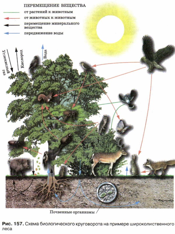 Биосфера § 45. Роль биосферы в природеВспомните За счет каких источников энергии существуют живые организмы? Что такое фотосинтез? Биологический круговоротКаждая группа организмов играет в биосфере определенную роль. Растения — посредники между Солнцем и Землей. С помощью фотосинтеза под действием солнечного света они создают первичные органические вещества. Следовательно, растения — это организмы-производители. Животные питаются растениями или другими животными, т. е. готовыми органическими веществами; это организмы-потребители. Поедая органические вещества, животные перемещают их по земной поверхности. Попутно они разносят споры, семена и тем самым способствуют расселению растений и грибов. Грибы и бактерии разлагают остатки отмерших организмов. Они превращают органические вещества в неорганические, которые вновь потребляются растениями. Таким образом, бактерии и грибы — это организмы-разрушители. При разложении органических веществ выделяется тепло, т. е. энергия, которая была когда-то поглощена от Солнца растениями. Если бы исчезли организмы-разрушители, была бы отравлена биосфера, так как многие продукты распада органических веществ ядовиты. Таким образом, живые организмы переносят вещество и энергию из одних частей биосферы в другие. Такой перенос веществ и энергии образует биологический круговорот (рис. 157). Как и круговорот воды, он связывает в единое целое все части природы. Нарушение биологического круговорота человеком грозит катастрофическими последствиями.