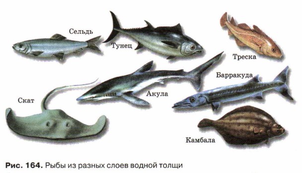 Биосфера § 47. Распространение жизни в океанеВспомните Как в зависимости от географической широты изменяется температура и соленость поверхностных вод океана? От чего зависит количество растворенного в воде кислорода? Что такое шельф? Распространение организмов в зависимости от глубиныС глубиной уменьшается количество солнечного света, растворенного в воде кислорода, нарастает давление. Верхний слой воды до глубины 100 м хорошо освещен и содержит много кислорода. Поэтому в этом слое находятся почти все растения и весь планктон океана. До глубины 1000 м простирается средний слой воды с сумеречным освещением. Еще глубже — до самого дна — располагается нижний слой, совсем не получающий света. В этом слое нет растений, здесь царство животных и бактерий. Насыщенность организмами здесь в несколько тысяч раз меньше, чем в верхнем слое. Из-за полного мрака у глубоководных животных развились специальные приспособления — органы свечения. Их используют для привлечения добычи, маскировки или введения в заблуждение жертвы или охотника. Обитатели глубин испытывают на себе давление воды. Чем больше глубина, тем выше давление. Люди, например, не могут находиться на глубине без специального оборудования. У глубоководных животных давление воды уравновешивается давлением жидкости внутри их организмов. Жизнь в толщах воды с разным давлением часто отражается на форме тела рыб (рис. 164).