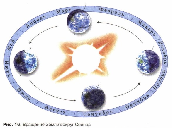 Для удобства продолжительность года считают равной 365 суткам. Оставшиеся 6 часов суммируются и каждые 4 года образуют дополнительные сутки. Такие годы называются високосными, в них не 365, а 366 суток. В високосные годы в самом коротком месяце — феврале — не 28, а 29 дней. Расчеты ученых показывают, что за все время существования Земли — 4,6 млрд лет — расстояние между ней и Солнцем оставалось практически неизменным. Если бы Солнце перестало притягивать Землю, она бы улетела в космос в 40 раз быстрее пули! Если бы Земля двигалась по орбите медленнее, она не смогла бы противостоять притяжению Солнца и упала бы на него. Если бы Земля находилась ближе к Солнцу, температура на ней была бы намного выше. На Венере, которая ближе к Солнцу на 42 млн км, температура около 500 °С! Если бы Земля находилась дальше от Солнца, температура на ней была бы отрицательной. Марс удален от Солнца на 228 млн км и на его поверхности температура -60 С. Полный оборот вокруг Солнца Земля совершает за 365 сут. и 6 ч. Этот период называется годом. Вопросы и задания 1. Назовите два основных вида движения Земли. 2. В какую сторону происходит вращение Земли вокруг своей оси? 3. Назовите следствия вращения Земли вокруг своей оси. 4. Назовите следствия вращения Земли вокруг Солнца.