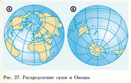 Природа Земли Температура воздуха на разных широтахВы догадаетесь, почему так происходит, если вспомните, что воздух нагревается от подстилающей поверхности, а она неоднородна. Например, суша разогревается и остывает быстрее, чем водная поверхность. И на суше обширные пространства пустынь, лесов, покровных ледников нагреваются по-разному. Существенно влияет на температуру и рельеф земной поверхности. Вспомните, что на больших высотах температуры, как правило, всегда ниже, чем на низменных равнинах. К тому же горные хребты загораживают те или иные области от проникновения тёплых или холодных ветров. А на поверхности океанов картину распределения температур осложняют морские течения. В Северном полушарии площади суши и Океана более или менее сравнимы (рис. 27, А). В Южном полушарии преобладает Океан (рис. 27, Б). Изотермы, проходящие над огромной водной поверхностью, не так сильно изгибаются, как на тех же широтах Северного полушария, колебания температур там меньше. И в том и в другом полушарии изогермы изгибаются при переходе с Океана на сушу. Кроме того, одинаковые изотермы в Северном полушарии «сдвинуты» к северу, это полушарие теплее. В Южном полушарии мало суши и «дышит» ледяная Антарктида. К тому же летний период в Северном полушарии на неделю дольше, чем в Южном (сравните промежутки времени от 21 марта до 23 сентября и от 23 сентября до 21 марта).