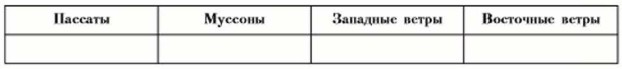 Это я знаю 1. Какие типы воздушных масс вы знаете? 2. Как образуются пассаты и в каких направлениях они дуют? 3. Как образуются западные ветры умеренных широт? 4. Что такое муссоны? В каких направлениях они дуют? 5. Выберите верный ответ. Большие объёмы воздуха тропосферы, обладающие однородными свойствами, называют: а) циркуляцией атмосферы; б) воздушной массой; в) восходящим движением воздуха. 6. Заполните пропуски в предложении: «Направление пассатов в Северном полушарии .... в Южном ..». 7. Название этих ветров в переводе на русский язык означает «ветры, благоприятствующие переезду». Действительно, во времена парусного флота они помогали совершать путешествия из Европы в Америку. Их называют: а) муссоны; б) западные ветры умеренных широт, в) пассаты; г) бризы. Это я могу 8. Заполните таблицу, указав области распространения и отличительные черты господствующих ветров.