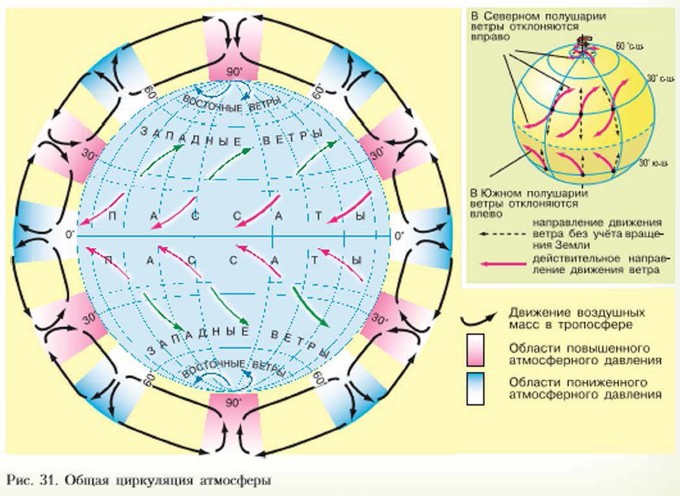 Что такое пассатыВетер возникает из-за разницы в атмосферном давлении, а вы знаете, что на Земле существуют относительно постоянные его пояса. От них и зависят господствующие ветры (иногда для простоты их называют постоянными), из которых самые известные — пассаты. Рассмотрите рисунок 31. Пассаты образуются в жарком тепловом поясе и дуют из области повышенного давления в районе 30° с. ш. и 30° ю. ш. в сторону окватора области с более низким давлением. Нели бы Земля не вращалась, то ветры в Северном полушарии дули бы точно с севера на юг. Но из-за вращения Земли ветры отклоняются от направления своего движения: в Северном полушарии — вправо, а в Южном полушарии — влево. Это явление называют эффектом Кориолиса — но имени французского учёного, и проявляется он в отношении не только ветров, но и, например, морских течений и подмыва соответствующих берегов крупных рек (в Северном полушарии — правых, в Южном — левых).