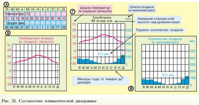 Изучаем климатическую диаграммуОчень важные климатические показатели — температура воздуха и количество осадков. Их изменение в течение года и соотношение между собой могут многое рассказать о климате территории. При этом очень удобно использовать климатические диаграммы, на которых одновременно показаны график годового хода температур и столбчатая диаграмма количества осадков но месяцам года в конкретном пункте (рис. 35). Например, был выбран пункт, средние многолетние данные метеорологических наблюдений для которой) указаны в таблице (рис. 35, А). Сначала построили фафнк хода среднемесячных температур (рис. 35, Б) и диа- грамму среднемесячного количества осадков (рис. 35, В). Затем график и диафам- му совместили (рис. 35, Г).