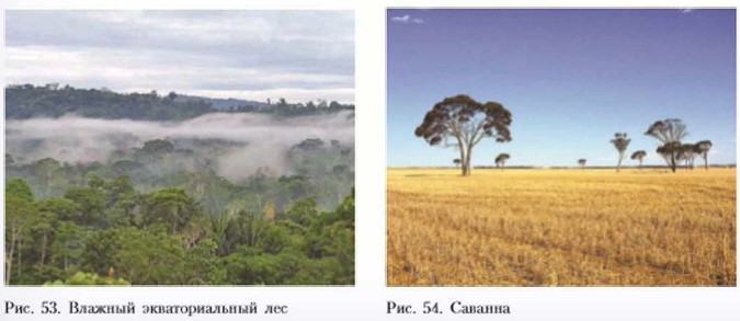 Обратите внимание, что в условиях примерно одного и того же количества осадков (менее 150-200 мм в год) в холодном тепловом поясе (в тундре) могут развиваться болота, а в жарком пустыни. При большом количестве осадков в жарком поясе уже появляются тропические леса Вы видите, что величины температур или осадков, взятые в отдельности, не позволят правильно судить о природе территории. Важно соотношение тепла и влаги, определяющее условия увлажнения. Это и есть (наряду с широтным положением) то главное, что отличает природные зоны друг от друга Каждая природная зона обладает собственным набором природных характеристик и их сочетаний. Наиболее ярко различия между зонами проявляются в растительном покрове. Например, на тех территориях, где увлажнение избыточное, обычно распространяются леса (рис. 53), а там, где недостаточное (на той же широте), — степи, полупустыни и пустыни. На тех территориях, где влаги может испариться столько же, сколько выпадает атмосферных осадков, располагаются лесостепи, обширные площади саванн (рис. 54).