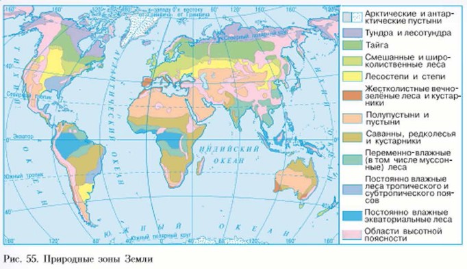Как сменяются природные зоны на земном шареВ соответствии с изменением климатических условий с севера на юг сменяют друг друга по широте и природные зоны (рис. 55). Кроме того, в зависимости от изменения климатических условий, но мере удалённости от океанов, природные зоны сменяются и в меридиональном направлении. Па различия в климатических условиях чутко реагируют растительность, животный мир и почвенный покров.