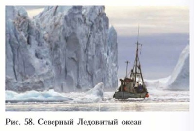 Природные комплексы и регионы § 21. ОкеаныКаковы особенности природы Северного Ледовитого океанаСеверный Ледовитый океан — наименьший из океанов но величине. Расположен он между Евразией и Северной Америкой. Средняя ею глубина в 3 раза меньше глубин остальных океанов. Это самый труднодоступный океан. Природа его отличается суровостью климата, обилием льдов (рис. 58), толщина которых 4-5 м, а иногда достигает 10 м. Не случайно в старину он назывался Студёным морем. Образование ледяною покрова связано с низкими температурами и относительно низкой солёностью вод.