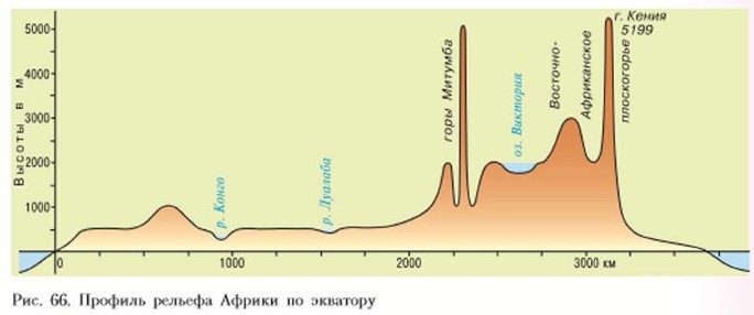Как строение земной коры и рельеф Африки влияют на её природу?Неизрезанная береговая линия подтверждает простое тектоническое строение Африки. Вы помните, что почти весь континент — это единая огромная «глыба» древней Африкано-Аравийской платформы. На физической карте преобладают отгонки коричневого цвета, особенно в восточной и южной частях материка. Лишь но побережьям и в долинах рек встречаются зелёные пятна низменностей. В целом рельеф Африки — это система преимущественно возвышенных равнин, а в восточной части — плоскогорий. Плоскогорья спускаются на более низкие равнины огромными уступами (рассмотрите профиль рельефа Африки на рис. 66). Реки в таких мостах низвергаются водопадами. Не удивительно, что в Африке находятся самые известные водопады: Виктория на реке Замбези, Ливингстона на реке Конго, Тугела на одноимённой реке (второй но высоте в мире — 933 м).