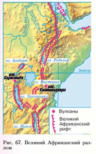 Великий Африканский разломУчёные считают, что Африка — часть расколовшейся в древности Гондваны. В кайнозойскую эру территория Африки оказалась в зоне растяжения земной коры и подверглась многочисленным разрывным нарушениям. По разломам происходили сводовые поднятия (сходным образом формируются срединно-океанические хребты). Так возникли Восточно-Африканское плоскогорье и продолжающее его на севере Эфиопское нагорье. По оси образовались глубокие узкие разломы (рифты), стенки которых постепенно удаляются друг от друга. В этих разломах расположены узкие вытянутые озёра — Танганьика, Ньяса, Рудольф, входящие в число самых глубоких в мире. В этом районе располагаются все действующие (точнее, дремлющие) вулканы Африки (кроме Камеруна). Здесь же встречаегся и множество потухших вулканов, а местами — выходы термальных источников. Продолжение Восточно-Африканской рифтовой системы (рис. 67) — узкая и глубокая впадина Красною моря, на дне которого также многочисленны небольшие вулканы. По данным наблюдений из космоса, берега Красного моря отдаляются друг от друга со скоростью 12-14 см/год.