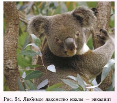 Материки и страны Австралия: образ материкаКак засушливость и изолированность Австралии влияют на её природуНо сравнению с Южной Африкой (узкой частью материка) протяжённость Австратии с запада на восток больше (см. рис. 91), поэтому климат в Австралии суше. Бо́льшую часть занимают пустыни и полупустыни, саванны и редколесья. Следствие засушливости — довольно скудные поверхностные воды. Единственная относительно крупная река — Муррей с притоком Дарлинг, стекающая с западных склонов Большого Водораздельного хребта и впадающая в Большой Австралийский залив Индийскою океана (длина Муррея с Дарлингом — 3750 км). В засушливом климате уровень воды даже в этих реках сильно колеблется, что мешает судоходству. Большинство же водотоков материка — пересыхающие, их называют крики. Озёр в Австралии немного, и большинство из них — солёные. Самое большое озеро Эйр-Норт, расположенное на 16 м ниже уровня моря. Однако Австралия знаменита Большим Артезианским бассейном крупнейшим в мире вместилищем подземных вод. Австралия существует изолированно от других крупных массивов суши длительное геологическое время. Только в Австралии сохранились растения и животные, которые вымерли на других материках. Это редкие и уникальные виды. Около 75% видов растений этого материка нигде больше не встречается. И животном мире особую роль играют сумчатые и яйцекладущие млекопитающие. Помимо кенгуру, к сумчатым животным относятся древесный медведь коала (рис. 94), похожий на сурка обитатель пустынь и сухих саванн вомбат, в лесах — сумчатые летяги, а на острове Тасмания сумчатый дьявол. Яйцекладущие млекопитающие утконос, ехидна. Знаменита Австралия и эвкалиптами. И разных природных зонах растёт около 600 видов эвкалиптов, в том числе императорский, достигающий высоты около 100 м (лишь секвойи в Калифорнии бывают выше).