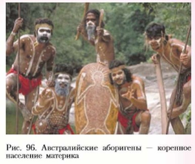 Почти все австралийцы живут в тех немногих частях страны, которые природа одарила благоприятными климатическими условиями. Это крайний юго-восток и юго-запад, а также отдельные участки восточного побережья. Вместе с тем более 2/3 территории континента (в том числе и с суровыми условиями) используется в хозяйстве. При разработке полезных ископаемых, в овцеводстве, при выращивании пшеницы используют самые современные технологии. Это не требует большого количества работников, но обеспечивает благоденствие всем гражданам. Основное население — англо-австралийцы, но много выходцев и и з других государств. Коренное население австралийские — аборигены (рис. 96) — составляет менее 2% современного населения страны. Девять и з десяти австралийцев живут в городах, в основном крупных (Сиднее, Мельбурне, Брисбене и др.). Многоэтажные здания расположены в центре городов, это место работы. Живут же австралийцы в отдельных коттеджах с садом и лужайкой. Именно поэтому города занимают большую территорию. Так, Сидней, в 2 раза уступая Москве но численности населения, в 10 раз превосходит её по площади. В отличие от многих, даже богатых стран, в австралийских городах практически нет трущоб. Занятые в сельском хозяйстве люди живут на фермах или в небольших благоустроенных поселках. Животноводческие формы, называемые станциями, зачастую удалены от ближайших поселений на сотни километров. Преуспевающие фермеры для нечастых поездок в город обзаводятся лёгкими самолётами.