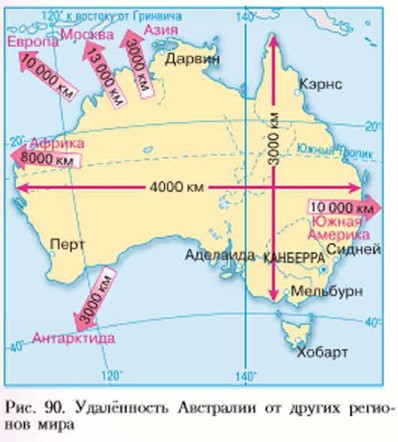 Австралия — самый маленький из материков и очень компактный, ею протяжённость с севера на юг и с запада на восток примерно одинакова (рис. 90). На физической карте Австралии (см. Приложеиие, с, 247) прежде всего найдите Южный тропик и определите, в каком направлении oт материка находятся акватор и начальный меридиан. Установите крайние точки материка. Вы без труда определите, что Австралия располагается в двух полушариях — Южном (по отношению к экватору) и Восточном (по отношению к начальному меридиану).