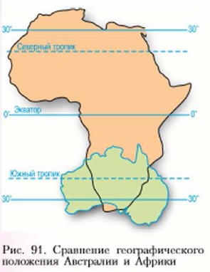 Что влияет на климат АвстрииВспомните, как географическое положение влияет на природу. На рисунке 91 вы видите, что Австралия лежит в тех же широтах, что и Южная Африка. Во-первых, обратите внимание, как проходит Южный тропик. Во-вторых, вспомните, что в тропических широтах образуются пояса высокого давления (см. рис. 28) и преобладает жаркий и сухой климат.