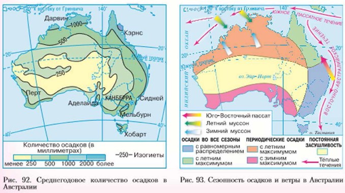 На восточную окраину континента осадки приходят с юго-восточными пассатами, которые приносят влажный воздух с Тихого океана (рис. 93). Теплое Восточно-Австралийское течение способствует дополнительному насыщению воздуха влагой. Большой Водораздельный хребет создаёт препятствие для проникновения влажного воздуха в глубь материка, и обильные осадки выпадают на ею восточных склонах. Количество осадков быстро уменьшается с удалением от берегов. Большую часть территории материка занимает область сухого тропического климата Лишь на крайнем севере материка климат субэкваториальный, а на крайнем юге — субтропический (см. рис. 33).