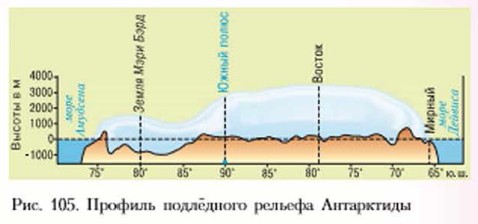 Ледники огромными языками сползают в окружающие материк моря, а откалываясь, образуют айсберги, которые ветер и течения выносят в открытый Океан. Антарктида — основной «поставщик» айсбергов. Строение Антарктиды довольно простое. В основании большей части материка лежит древняя Антарктическая платформа. И только горы, начинающиеся на Антарктическом полуострове, и продолжающие их Трансантарктические горы вдоль западной окраины материка относятся к альпийской складчатости. Эти горы являются продолжением Анд и частью Тихоокеанского огненного кольца. Здесь есть действующие вулканы. Ледяной панцирь материка называют Ледяной Антарктидой, а сушу под ним — Каменной Антарктидой. По сравнению с Ледяной рельеф Каменной Антарктиды сложнее. Под толщей льда обнаружены горы и равнины (рис. 105). Исследования показали, что местами под колоссальной тяжестью льда подлёдная поверхность материка прогнулась, опустившись ниже уровня моря на 2,5 км.