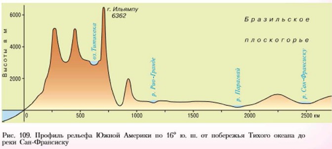 Строение земной коры и рельеф: сравниваем Южную Америку и АфрикуИзучая материки, мы велел за определением географического положения описываем рельеф и подтверждаем его связь со строением земной коры. Изучим этот вопрос, используя географические карты как источник информации и сравнение как метод (образ действия). Мам понадобятся физические карты Южной Америки и Африки (см. Приложение, с. 246 и 249) и карты литосферных плит, строения земной коры (см. рис. 18 на с. 30 и рис. 23 на с. 33). Дополнительно полезно использовать географический атлас, словари и поисковые системы Интернета. Читаем карту Южной Америки1. Посмотрим на физическую карту Южной Америки. Отметим основную особенность: мощная горная система вдоль всей западной границы материка — Анды и обширные равнины (низменности, плоскогорья, возвышенности) на остальной территории. На западе Южной Америки океаническая плита «соскальзывает» под плиту с материковой корой. Обязуются глубоководные желоба (найдите их на физической карте мира, с. 242-243 Приложения), а материковая кора сминается в складки — поднимаются Анды (рис. 109). Южная Америка — материк с самым контрасным рельефом для Южного полушария: перепад высот более 7 км. (Вспомните, что в Африке практически весъ материк занят высокими равнинами, а мощных горных цепей нет.)