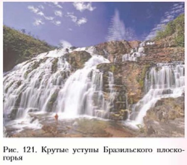 На Бразильском плоскогорье распространены саванны с сухолюбивыми травянистыми растениями, кактусами, молочаями. Здесь пасутся большие стада крупного рогатого скота (по их поголовью Бразилия на втором месте в мире после Индии). В редколесьях растёт знаменитое железное дерево (кебрачо) с чрезвычайно твёрдой древесиной. Бразильцы называют эти саванны «камнос», что в переводе с португальского означает «равнина». На Орипокской низменности саванны называют «льянос» — ровные, но в переводе с испанского. Льянос — это высокотравные саванны с рощами из пальм и акаций. Если бы, покинув столицу Бразилиа, мы отклонились к западу от нашего маршрута в сторону боливийской границы, то смогли бы увидеть край Бразильского плоскогорья. Крутым уступом он нависает над долинами рок (рис. 121). Однако наш путь лежит на северо-запад, в Амазонию — так называют природную область, которая занимает Амазонскую низменность и прилегающие низкие части Бразильского и Гвианского плоскогорий. Мы и не заметим, как пологий склон плоскогорья переходит в величайшую низменную равнину Земли. Геологическую границу древнего фундамента и мощного осадочного чехла позволят разглядеть, пожалуй, только космические снимки.
