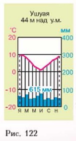 1. Ушуая — главный населённный пункт Огненной Земли. Но климатической диаграмме на рисунке 122 охарактеризуйте особенности климата архипелага. Определите тип климата.