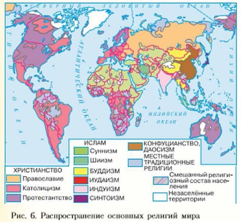 Население Земли Народы, языки и религиКакие существуют религииС древних времён религия (от латинского слова religio — набожность, святыня) давала ответы на самые главные вопросы жизни. Среди всех религий, которые исповедует население мира, выделяют три мировые религии. Это христианство различных направлений (православие, католицизм, протестантство и др.), ислам (мусульманство) и буддизм. Оми распространены во многих странах мира (рис. 6).