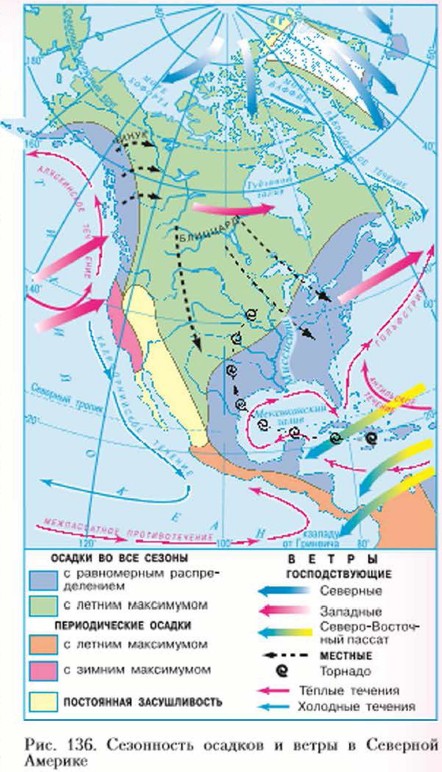 Не откладывайте физическую карту и ещё раз обратите внимание на рельеф Северной Америки. Кордильеры отделяют центральные области континента от влияния Тихого океана, а Аппалачи — от воздействия Атлантики; на севере и юге горных хребтов нет. Возникает своеобразный коридор, где воздушные массы не встречают препятствий. Рассмотрите карту на рисунке 136. В пределах Центральных и Великих равнин большую часть года формируется область низкого давления умеренного пояса. В неё периодически устремляются воздушные массы из поясов высокого давления — то арктические с севера, то тропические с юга. Нередко встречи разнородных воздушных масс порождают мощные завихрения воздуха — торнадо (смерчи). Это малые атмосферные вихри (диаметром всего несколько сотен метров) с пониженным давлением в центре и ураганными скоростями ветра. Центральные районы Северной Америки — одни из наиболее торнадоопасных регионов мира.