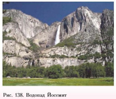 Озёрные котловины имеют самое разнообразное происхождение. Наиболее крупные из многочисленных озёрных котловин (Великие, Виннипег, Большое Медвежье, Большое Невольничье, Атабаска и др.) возникли в тектонических разломах, углублённых при движении покровных ледников. Остатком древнего ледникового озера является Большое Солёное в Большом Бассейне. Это — бессточное озеро. В зависимости от количества атмосферных осадков площадь и солёность этот озера меняются: от 2500 до 6000 км2 и от 137 до 300%о. В долитое рек материка множество старичных озёр. Многочисленные и полноводные реки питаются не только дождями и подземными водами, но и снегами. В Северной Америке протекает третья в мире по длине (6240 км) и по площади бассейна (33 млн км2) река — Миссисипи с Миссури. В Кордильерах находится самая крупная в мире горная речная долина (каньон с множеством структурных ступенек на склонах) — Большой каньон реки Колорадо, а также третий в мире но высоте водопад Йосемит (727 м) в хребтах Сьерра-Невады (рис. 138). Широко известен Ниагарский водопад, высота которого не очень большая (около 50 м), но зато весьма значительна ширина (около 1,5 км).