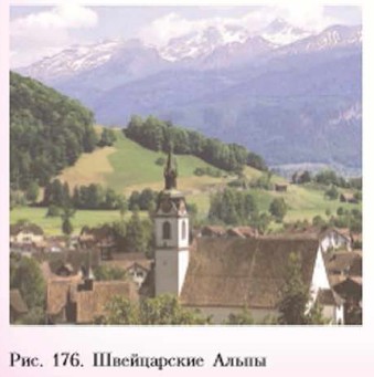 Материки и страны Европа: путешествие (2)От Германии до СицилииМы повернём к югу и полетим над Альпами из Германии в Италию над территорией Швейцарии (рис. 176). Здесь много популярных горных курортов. Мы полюбуемся заснеженными горными никами, серебристыми речками на дне ущелий, ослепительно синими озерами и зелёными альпийскими лугами. Мощные горные ледники избороздили скальные породы глубокими царапинами, выпахали корытообразные долины, сделали острыми гребни хребтов. Такой тип рельефа называют альпийским. Из-под альпийских ледников вытекает множество рек, самые крупные из них — Рейн и Рона. Мы пересечём верховья Рейна, протекающего через Боденское озеро к востоку от нашего маршрута. Ещё южнее пролетим над долиной Роны, которая протекает через Женевское озеро. Само озеро лежит на высоте 372 м, а менее чем в 100 км от него на 4807 м поднимается высочайшая вершина Альп и зарубежной Европы Монблан. Горные пики над озёрами покрыты льдами, а внизу растут теплолюбивые магнолии. В Альпах много удобных перевалов, через которые проложены дороги или пробиты тоннели. Мы можем пролететь и Италию над перевалом Большой Сон-Бернар, или Симплон, или Сен-Готард (именно его преодолевала армия А. В. Суворова в 1799 г.). Юго-восточные склоны Альп круто оборвутся к Миланской равнине, но которой протекает река Мо.