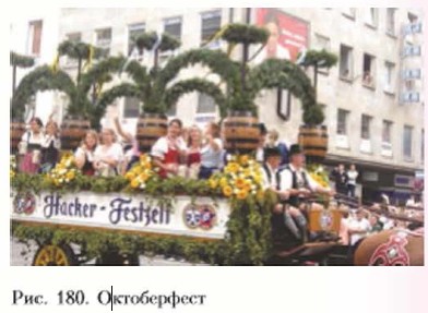 Немецкий образ жизниНемцы слывут трудолюбивыми, дисциплинированными и даже педантичными людьми, что не мешает им любить обильную трапезу в шумной компании. В традиционное меню входит варёный картофель и квашеная капуста с десятками разновидностей колбас и сосисок. Впрочем, сейчас этот набор всё больше остаётся в прошлом и заменяется блюдами самых разных кухонь. А вот пристрастие к пиву, число сортов которого исчисляется сотнями, остаётся неизменным. Апофеозом этой любви является ежегодный пивной праздник Октоберфест (рис. 180), приуроченный к окончанию сбора хмеля. Он проводится в Мюнхене, куда съезжаются сотни тысяч людей.