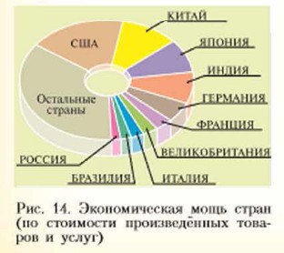 Население Земли Страны мираКакие страны самые развитыеВ экономике выделяются страны с разным уровнем развития. Сравнить страны но территории и населению проще, чем выяснить, как они соотносятся между собой по экономической мощи. Существуют специальные показатели и методы их расчёта, с которыми вы познакомитесь в старших классах. Главное — запомнить, что эти показатели зависят от общей стоимости товаров и услуг, произведённых в стране за год. Это характеризует богатство страны в целом и позволяет подсчитать, сколько приходится на каждого жителя. На рисунке 14 мы видим, что одна из стран мира — США — лидирует но объёму своей экономики: её доля составляет 20% от мирового хозяйства Большинство стран Европы, объединённых в Евросоюз (27 стран), производит меньше. На втором месте Китай. Среди крупных стран у Китая самый быстрый рост. Экономию Китая увеличилась за 10 лет в 3 раза, а но выпуску отдельных видов промышленной продукции он вышел в лидеры. Доля России пока составляет только 2,5%. Но в настоящее время у нас наблюдается экономический рост.