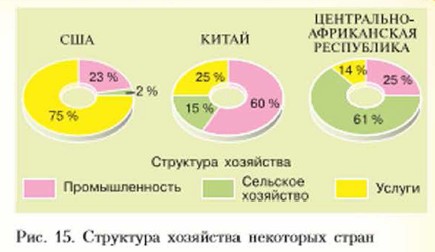 Очень важно, какие отрасли хозяйства преобладают в экономике страны и сколько людей занято в этих отраслях (рис. 15). Но многих странах мира основу экономики составляет сельское хозяйство. Как правило, это бедные страны с невысоким уровнем развития (например, большинство африканских стран). В ряде стран в струюуре хозяйства преобладают промышленные отрасли (Бразилия, Индия, Китай и др) у этих стран большие возможности для дальнейшего развития. В экономике высокоразвитых и богатых стран (США, Великобритания, Германия, Франция, Япония и др.) преобладают услуги: торговля, образование, здравоохранение, жилищное хозяйство, пассажирский транспорт, средства массовой информации, связь, т.е. отрасли, улучшающие условия жизни людей.