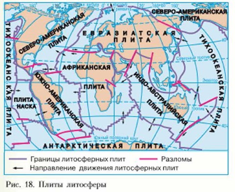 Природа Земли Развитие земной корыЛитосферные плиты имеют разные размеры, и границы их не совпадают с границами материков и океанов. Границы литосферных плит проходят на суше по торным поясам, а в океанах — по срединно-океаническим хребтам. На рисунке 18 обратите внимание на стрелки, указывающие направление движения плит. Вы видите, что плиты расходятся в разные стороны от гигантских планетарных разломов (рифтов), образовавшихся в результате сильнейших растяжений земной коры. Такие глубокие разломы есть и на суше, и в океанах, и их протяжённость составляет сотни и тысячи километров.