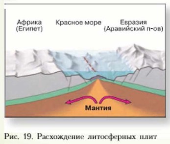 На суше в зонах разломов расположились, например, цепочка восточноафриканских озёр (среди них озёра Ньяса, Танганьика), наше озеро Байкал. К рифтовому поясу относятся также Большой Бассейн в Кордильерах, впадина Красного моря. В океанах у оси срединно-океанического хребта, рассечённого глубокими разломами, из недр Земли поднимаются мощные потоки маты и, застывая, наращивают края расходящихся плит (рис. 19). Образуется новая земная кора, и ложе океана расширяется. Так, например, расширяется ложе Атлантического океана в последние 180 млн лет.