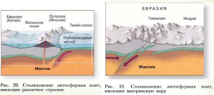 Расходящиеся плиты сталкиваются с соседними (найдите на рисунке 18 линии столкновений). Если край плиты с океанической корой «соскальзывает» под плиту с материковой корой, образуются глубоководные желоба и островные дут (рис. 20). Если сталкиваются плиты с материковой корой, то края этих плит вместе с накопленными на них слоями горных пород сминаются в складки, и поднимаются горы (рис. 21).