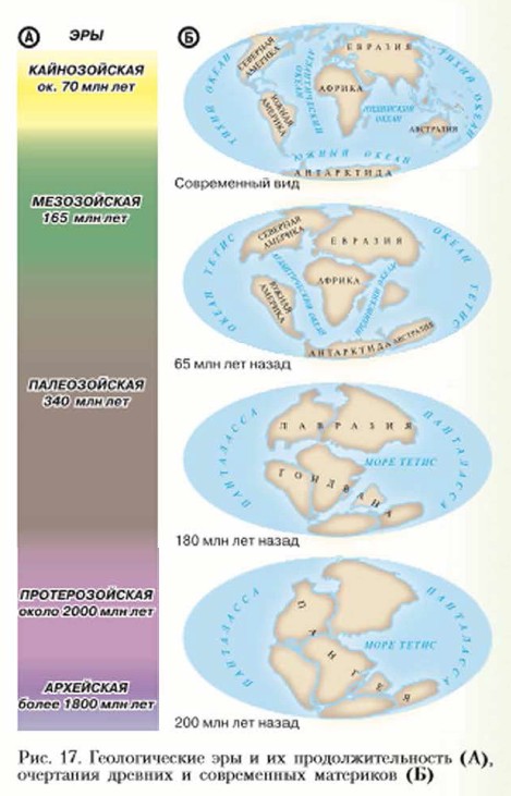 Со времени образования земной коры и появления первых материков прошло несколько миллиардов лет (вспомните, что возраст нашей планеты — около 4,5 млрд лет). За это время материки меняли свои очертания, внешний облик и внутреннее строение. Менялся климат — потепление сменялось оледенением и снова потеплением. Появлялись и исчезали различные виды животных и растений. Последовательность событий в развитии земной коры запечатлена в слоях горных пород. В них сохранились окаменелые остатки растений и животных или их отпечатки (их можно найти в обнажениях на высоких берегах рек или склонах оврагов). Для каждого из слоёв характерны определённые виды органических остатков, но которым устанавливают возраст горных пород. Именно так учёные выделили в истории Земли 5 геологических эр (см. рис. 17). Названия эр произошли от греческих слов: зоес означает живой, археос — изначальный, протерос — ранний, палеос — древний, мезос — средний, кайнос — новый. 3 каждой эре происходили процессы горообразования и изменения рельефа. Рельеф выравнивался при разрушении гор, приобретал особые черты под действием ледников. Менялся климат, шло развитие живых организмов.
