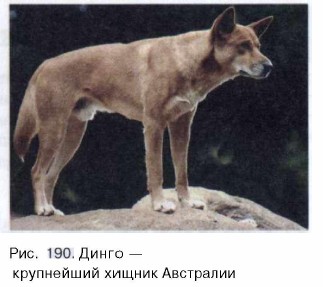 Австралия — маленький великан Особенности природы Австралии. ГеографияБыло сказано, что почти все австралийские животные сумчатые. Почти? Значит, все-таки не все? Не все. Самый многочисленный, самый крупный хищник материка не относится к сумчатым. Это динго. Дикая собака динго. Точнее говоря, динго не совсем австралийское животное. Собака появилась здесь одновременно с человеком. А первые люди попали в Австралию примерно 10 тыс. лет назад. Динго — средних размеров собака рыжевато-желтого цвета (рис. 190).