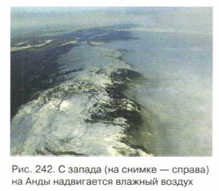 Южная Америка — вытянутый материк, поэтому влияние океанов на климат материка должно быть значительным, ведь материк может насквозь продуваться морскими ветрами. Если, конечно, эти ветры есть. В Южной Америке они есть. Материк находится в зоне действия только двух систем постоянных ветров. Климат большей части территории зависит от пассатов, несущих влажный воздух со стороны Атлантики. А южная оконечность находится под воздействием ветров западного переноса. Мы помним, что влияние океана на климат может усиливаться или ослабевать благодаря морским течениям. Вдоль западных берегов Южной Америки движется мощное холодное Перуанское течение (его еще называют течением Гумбольдта). Это холодное течение делает морской воздух менее влажным. У восточных берегов картина иная: здесь преобладает движение теплых вод Гвианского и Бразильского течений. Таким образом, влияние Тихого океана на климат Южной Америки гораздо слабее, чем влияние Атлантики. Малая роль Тихого океана и одновременно очень большая роль Атлантического в формировании климата Южной Америки связана и с особенностями рельефа материка, наличием на его западе берегового горного хребта. Анды стеной стоят на пути влажного воздуха со стороны Тихого океана. А что касается Атлантического океана, то его влиянию особенности рельефа материка только способствуют: ведь восточная часть Южной Америки равнинная. Почему же климат Южной Америки более влажный, чем климат любого другого материка? Большая часть материка расположена в зоне действия пассатов с Атлантического океана. Их проникновению в глубь материка не препятствует равнинный характер поверхности. Влажный морской воздух, проходя над всей восточной частью Южной Америки, отдает часть содержащейся в нем влаги. Уже это объясняет отсутствие на материке районов с сухим климатом, но это не единственная причина. Когда пассаты уже практически преодолевают равнинные пространства Южной Америки и до Тихого океана остается всего несколько десятков километров, на их пути стеной встают Анды. Воздух начинает подниматься вверх, чтобы перевалить через это препятствие. В процессе этого восходящего движения воздух остывает, происходит конденсация водяного пара и оставшаяся в нем влага проливается на склоны гор дождями (рис. 242). Помните про орографические осадки? Именно они и возникают здесь. Восточные склоны Анд в зоне действия пассатов — одно из самых дождливых мест на планете. В некоторых местах за год бывает всего несколько погожих дней. Выпавшие в горах дожди рождают могучие реки, которые стекают на равнину и несут свои воды в Атлантику. Испарение воды с поверхности этих рек вновь поступает в воздух, делая его более влажным. Ведь климат-то жаркий, значит, и испарение воды очень сильное.