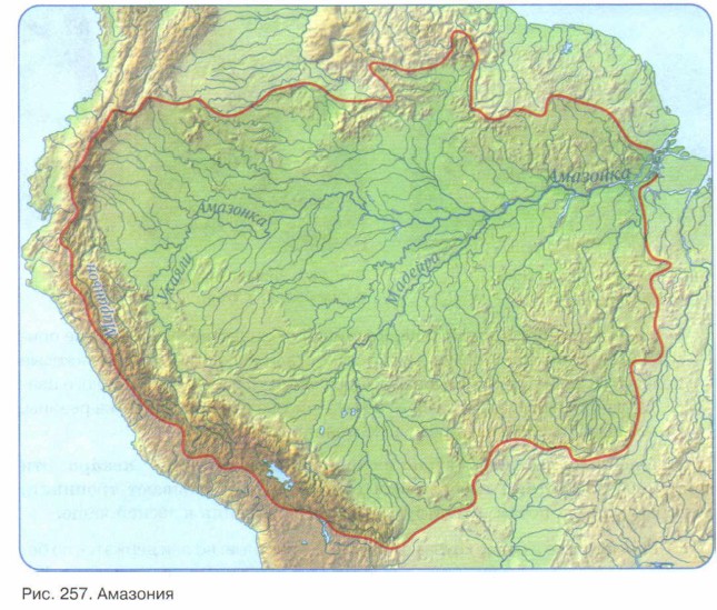 Южная Америка — материк чудес § 39. Разнообразие природы Южной АмерикиВспомните На каком материке обитают тигры? Людей какой профессии называют ковбоями? Южная Америка имеет почти такую же длину, как и Африка, но простирается она гораздо дальше к югу, ведь экватор пересекает ее только в самой северной части. Поэтому природа Южной Америки более разнообразна. Хотя сходство, конечно, есть. Вспомним роман Жюля Верна «Пятнадцатилетний капитан». Его герои в результате стечения недобрых обстоятельств вместо Южной Америки оказались в Экваториальной Африке. Прошло несколько дней, прежде чем они поняли свою ошибку, да и то это произошло, в сущности, случайно. При этом среди них был ученый-натуралист! О чем это говорит? Да о том, что природа некоторых районов Южной Америки очень похожа на африканскую. Но различия, конечно, есть. Особенно отчетливо они заметны при изучении растительного и животного мира материка. Кстати, именно пойманная муха натолкнула героев романа Жюля Верна на правильную мысль о том, что они находятся немножко не там, где думали. Итак, давайте рассмотрим основные черты природы Южной Америки. Зона влажных экваториальных лесов Южной АмерикиСамое большое украшение материка — это, несомненно, его экваториальные леса. Они занимают большую часть Амазонской низменности. Всю эту лесную область материка называют Амазонией (рис. 257). Ее площадь превышает 2 млн км2. Это больше трети площади всех лесов жаркого пояса.