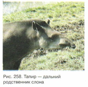 Вы уже знаете, что в Южной Америке леса называют сельвой. Так какова же она — амазонская сельва? Внешне она не слишком отличается от африканских джунглей. Это многоярусные леса, состоящие из огромных деревьев, поднимающихся на высоту многих десятков метров, где они и раскидывают свои обширные кроны. Более 3 тыс. видов деревьев растет в сельве! Перечислить даже малую их часть невозможно. Назовем только некоторые. Сейба — одно из самых высоких деревьев на планете. Ее высота превышает 80 м! Бразил — дерево с очень красивой древесиной, давшее название самой большой стране Южной Америки. Вы уже догадались, какой именно? Бальса — дерево, древесина которого легче пробки и совершенно не гниет в воде. Листья хинного дерева содержат хинин — вещество, позволившее приготовить лекарства, с помощью которых стали излечимы многие тяжелые болезни. А если сделать надрез на коре гевеи, то появится сок белого цвета. Он загустеет и превратится в каучук — сырье для производства резины. Остальные 3 тыс. видов деревьев не менее замечательны. Под пологом леса перемещаются только дикие свиньи — пекари. Эти некрупные животные небольшими группами протаптывают тропинки, которые жители потом используют для передвижения в лесной чаще. Есть в сельве и более крупные наземные животные, но они держатся по берегам рек и в густые заросли не заходят. Речь идет о тапире и капибаре. Капибара — крупнейший грызун на планете. Представьте морскую свинку ростом полметра и весом около 60 кг. Вот примерно так выглядит капибара. Тапир — очень дальний родственник слона, правда, совсем на него непохожий (рис. 258). И тапир и капибара значительную часть времени проводят в воде, прекрасно плавают, но пастись выходят на берег.