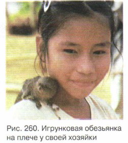 Заметны они прежде всего своими голосами, удивительно резкими и громкими. По утрам, когда стая ревунов демонстрирует свое хоровое пение, никаких других звуков в лесу уже не слышно. С помощью специальной аппаратуры определили, что стая ревунов издает звук, по мощности равный звуку взлетающего реактивного самолета! А ведь ревун — не такая уж и крупная обезьяна. А вот услышать игрунковую обезьяну нам не удастся. Да и увидеть ее тоже не так-то просто. Ведь она совсем маленькая: на ладони легко может уместиться пара игрунок. Трудно разглядеть в листве такую крошку, несмотря на то что ее украшает черно-белый полосатый хвост, который в два раза длиннее ее тела (рис. 260).