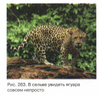 А есть ли хищники в этих лесах? Конечно, и немало. Самым крупным из них является ягуар — красивая крупная пятнистая кошка (рис. 263).