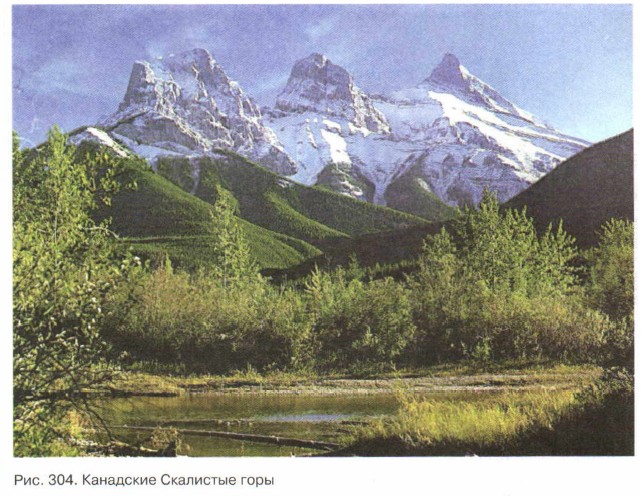 Как и Анды, Кордильеры — это не один горный хребет, а несколько параллельных хребтов. В системе Кордильер выделяют три пояса: Западный, Восточный и Центральный. Западный пояс гор составляют Береговые хребты, протянувшиеся вдоль Тихоокеанского побережья. Центральный пояс представлен плоскими приподнятыми плато и плоскогорьями. Самые заметные из них — плоскогорье Юкон на севере материка, плоскогорья Большой Бассейн и Колорадо — в средней части и Мексиканское нагорье — на юге материка. Береговые хребты отгораживают их от влажных тихоокеанских ветров, поэтому большая часть их поверхности представляет собой пустыню. В южной части Большого Бассейна находится Долина Смерти — самая глубокая впадина на поверхности материка. С восточной стороны эти плоскогорья ограничены еще одним горным хребтом, который называется Скалистыми горами (рис. 304). Скалистые горы и составляют Восточный пояс Кордильер. Вот вся эта система, включающая Береговые хребты, Скалистые горы и лежащие между ними плоскогорья, и называется Кордильерами.