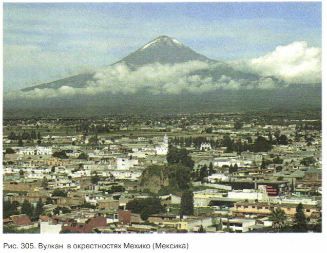 Горообразование в районе Кордильер началось еще в мезозое и продолжается в настоящее время {рис. 305). Оно проявляется в частых землетрясениях. Очень сильным было землетрясение 1964 г., разрушившее столицу Мексики Мехико. А в 1966 г. именно в Мехико должен был проходить чемпионат мира по футболу! Встал вопрос о переносе места его проведения. Но что бы вы думали? За два года мексиканцы полностью восстановили свой город, и футбольный праздник, как и намечалось, прошел в столице Мексики.