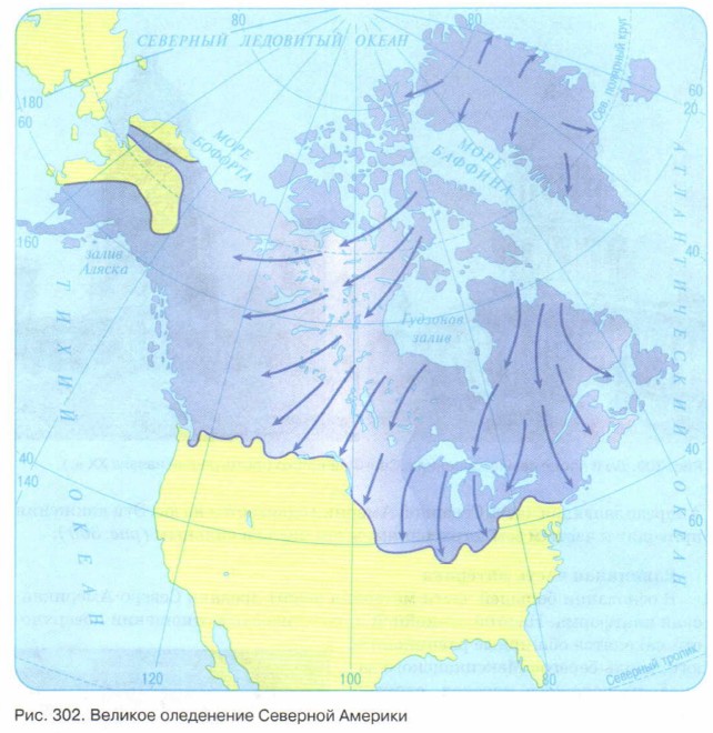 На рельеф северо-восточной части материка огромное влияние оказал Великий ледник, пришедший с Гренландии во время ледникового периода (рис. 302). Многокилометровый ледяной покров, как бульдозер, выравнивал неровности рельефа. Когда ледниковый период сменился эпохой потепления климата, ледник разрушился. На освободившейся ото льда поверхности возникла холмистая равнина.