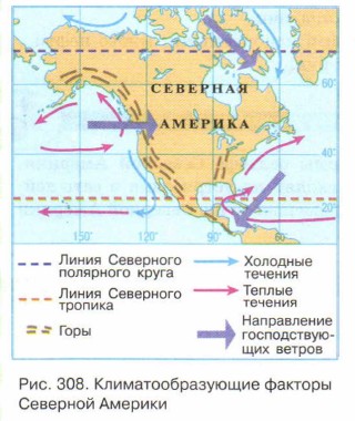 Северная Америка — знакомый незнакомец § 44. Климат Северной АмерикиВспомните Что такое орографические осадки? Как называется система постоянных ветров, действующая в умеренных широтах? Климатообразующие факторы Северной АмерикиУже говорилось о том, что природные условия, в том числе и климатические, в Северной Америке разнообразнее, чем в Южной (рис. 308). И первая причина этого разнообразия заключается в особенностях широтного положения материка, который имеет значительную протяженность с севера на юг. Начинаясь недалеко от экватора, Северная Америка простирается до полярных широт. Впервые нам встречается материк, на котором есть почти все существующие на планете климатические пояса. Набор климатических поясов впечатляет: от субэкваториального до арктического! Нет только одного климатического пояса — экваториального.
