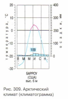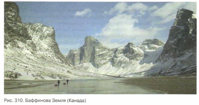 Зима сменяется коротким холодным летом с отрицательными или близкими к нулю суточными температурами. Лишь иногда в летнее время дневная температура поднимается до +5 °С. Количество осадков невелико. Этот климат можно считать сухим. Большая часть осадков выпадает в летнее время года. Причем даже летом они могут выпадать в виде снега. Хотя снега выпадает немного, но и он не успевает растаять за короткое арктическое лето. Накапливающийся из года в год снег превращается в лед. Именно так все происходит в Антарктиде. В результате значительная часть территории Северо-Американской Арктики подвержена современному оледенению. Особенно мощными ледяными щитами покрыты Гренландия и остров Элсмир — самый северный в Канадском Арктическом архипелаге. Краем «Белого безмолвия» назвал север материка Джек Лондон (рис. 310).