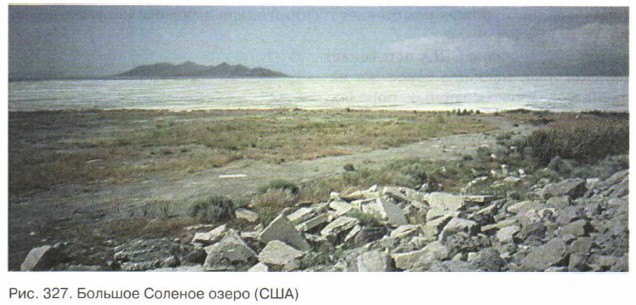 Северная Америка — знакомый незнакомец Гидрография Северной Америки. ГеографияБассейн внутреннего стока Северной АмерикиНе все реки Северной Америки впадают в океан. Путь некоторых заканчивается в бессточных озерах, не имеющих связи с Мировым океаном. Такие озера можно обнаружить в Кордильерах, на центральных плоскогорьях. Ведь с одной стороны их отделяет от океана стена берегового хребта, а с другой — Скалистые горы. Это самый сухой район Северной Америки. Рек почти нет, зато есть озера. Все они — соленые. Мы уже говорили о том, почему бессточные озера всегда бывают солеными (см. § 24). С течением времени в бессточных озерах происходит накопление солей. Чем дольше существует такое озеро, тем оно более соленое. А в некоторых из таких озер и воды-то не видно, так как она вся скрыта под многометровым слоем соли. Таково Большое Соленое озеро, расположенное в центре пустыни Юта (рис. 327). Соль покрывает его поверхность идеально ровным и идеально горизонтальным слоем. По поверхности соли можно не только ходить, но и ездить.