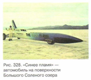 Да еще как ездить! Здесь просто идеальные условия для испытания машин с целью установления новых рекордов скорости. Именно по поверхности Большого Соленого озера автомобиль, снабженный ракетным двигателем, промчался со скоростью... Держитесь крепче! Со скоростью больше 1 тыс. км/ч (рис. 328)! Рекорды скорости для мотоциклов и велосипедов также были установлены здесь. Да что велосипеды! В 1981 г. на поверхность озера сел американский космический корабль «Колумбия»!