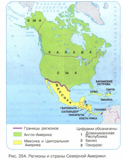 Северная Америка — знакомый незнакомец § 48. Регионы Северной АмерикиВспомните В каких странах население говорит на английском языке? что такое гейзер? В Северной Америке можно выделить два региона {рис. 354). Северную часть материка занимает Англо-Америка. Этот регион еще называют — Страны северной и средней части Северной Америки, но это очень длинно и сложно... К югу от территории США расположен еще один регион — Центральная Америка, в которую входят Мексика, несколько небольших стран Панамского перешейка и почти 20 островных стран в бассейне Карибского моря.